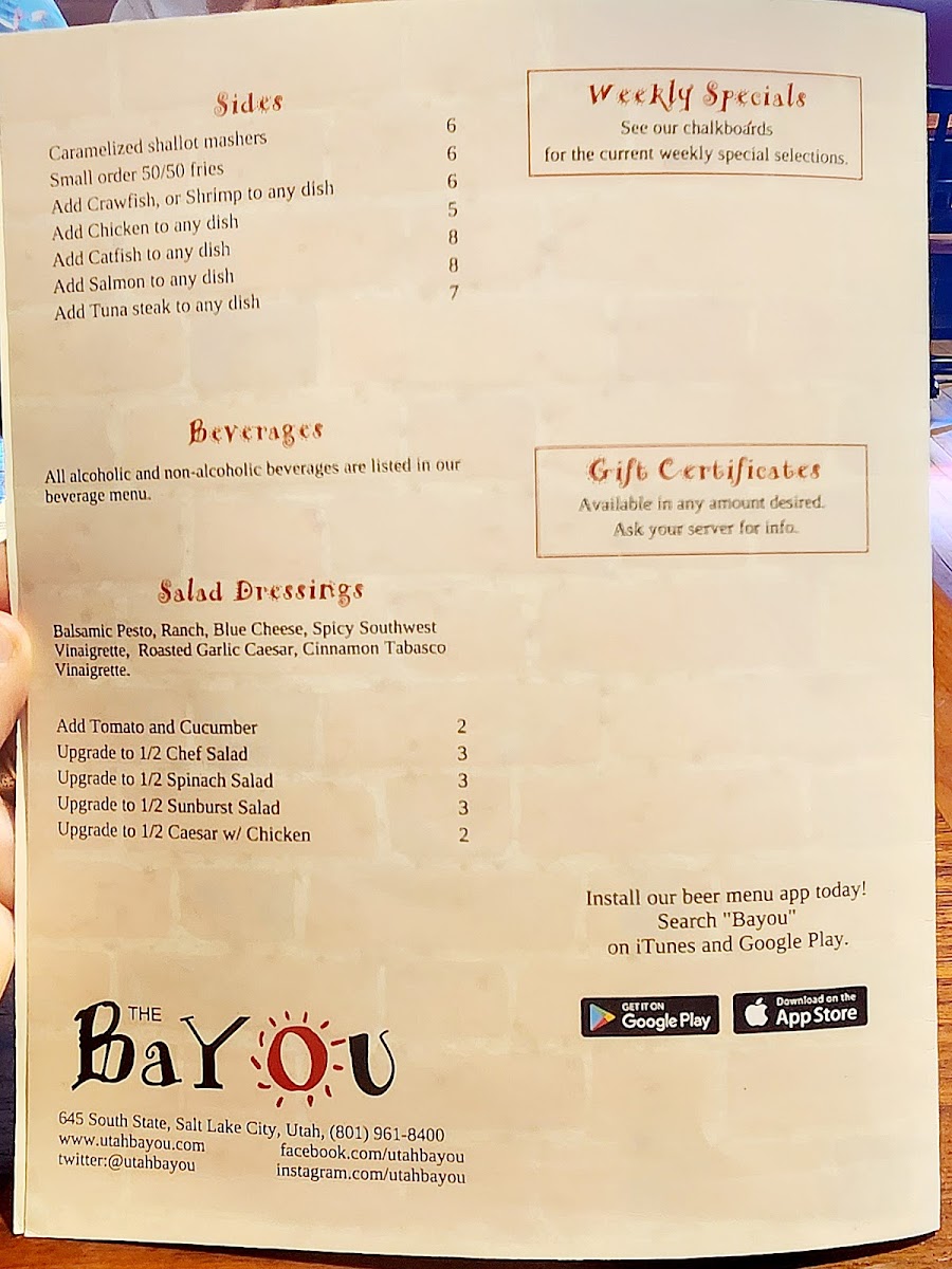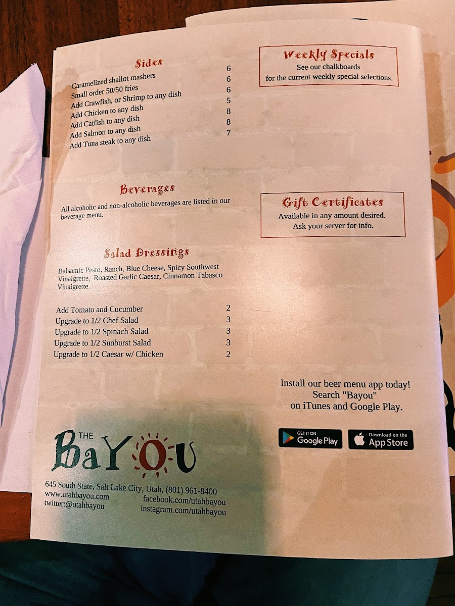 Welcome to The Bayou, a vibrant Cajun restaurant nestled in the heart of Salt Lake City. Located at 645 S State St, this gem serves up a hearty menu that pays homage to traditional Southern flavors with a modern twist.