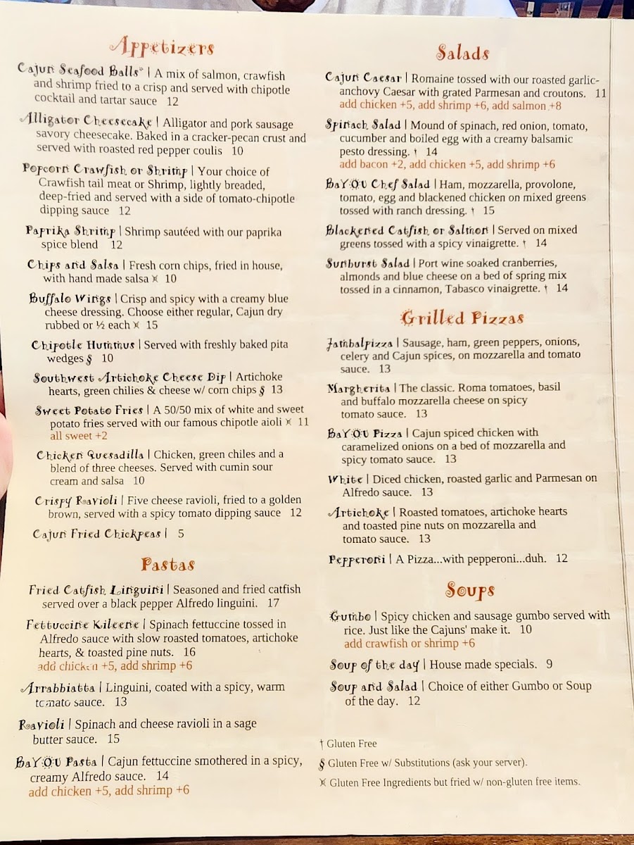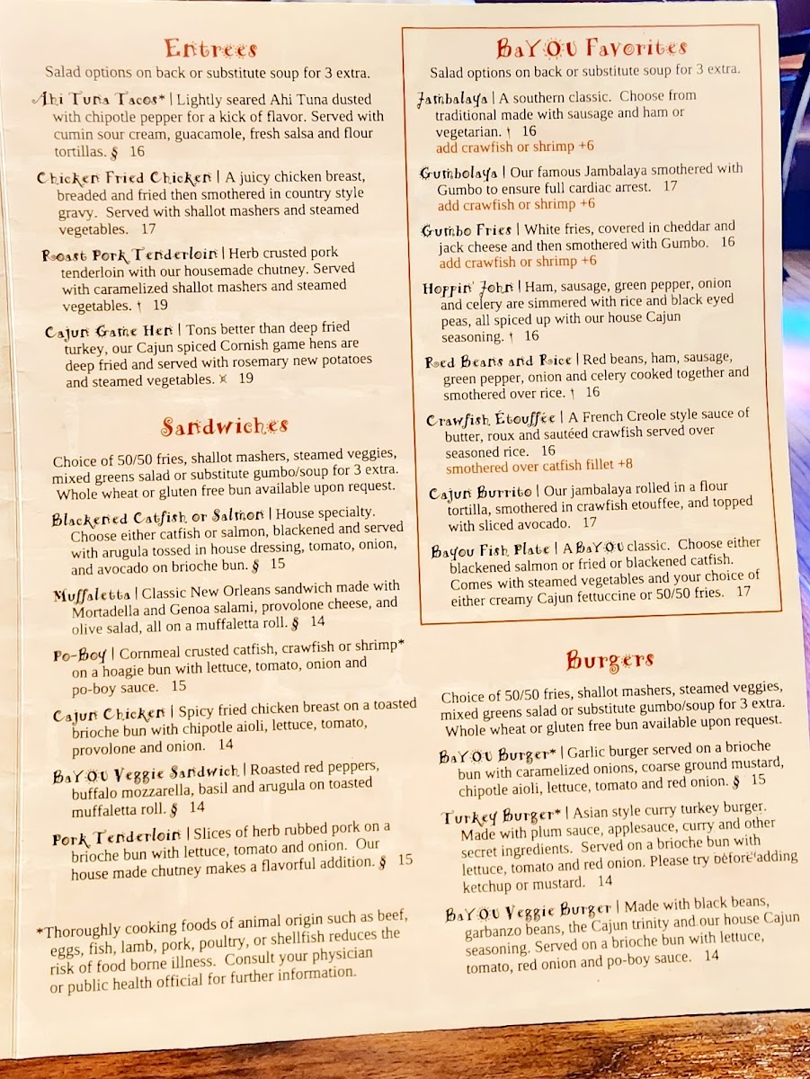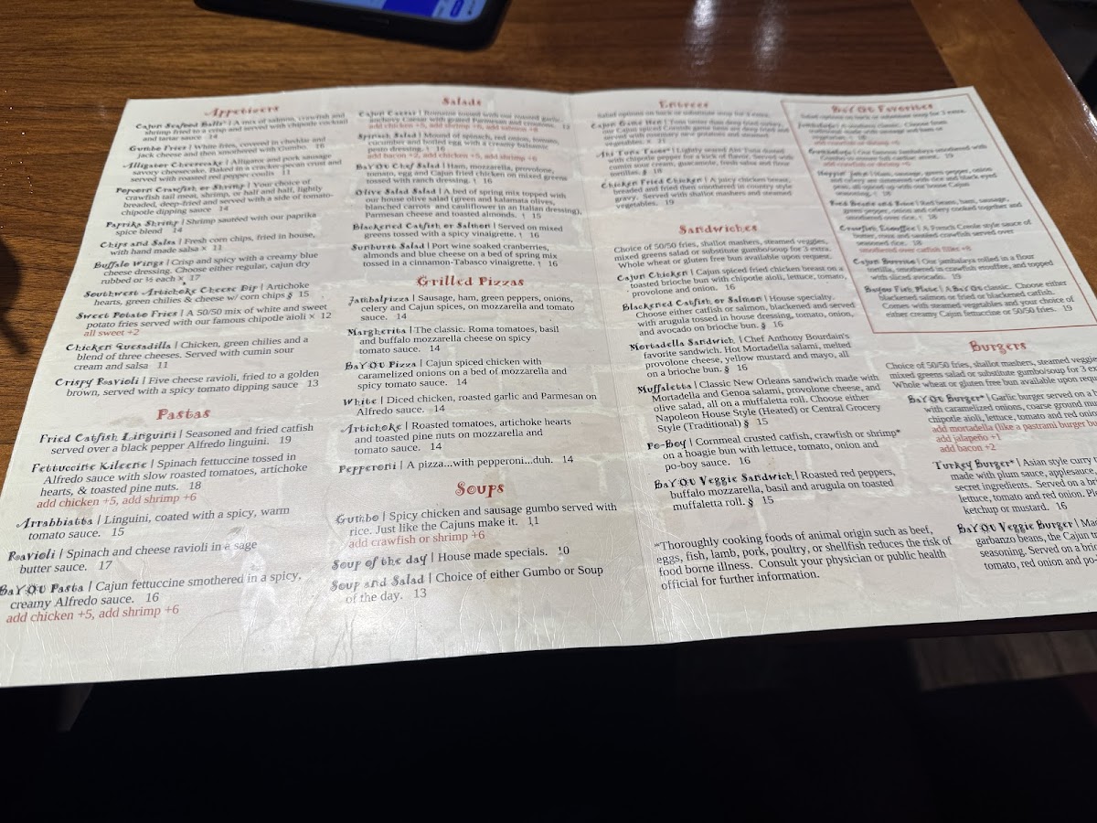 The Bayou's offerings are impressive, featuring delectable items like the Bayou Burger with its garlic-infused flair and the Cajun Veggie Burger, both served on house-made sourdough buns. For pizza lovers, the Jambal Pizza bursts with the flavors of jambalaya, while the Artichoke Pizza provides a lighter, roasted option.